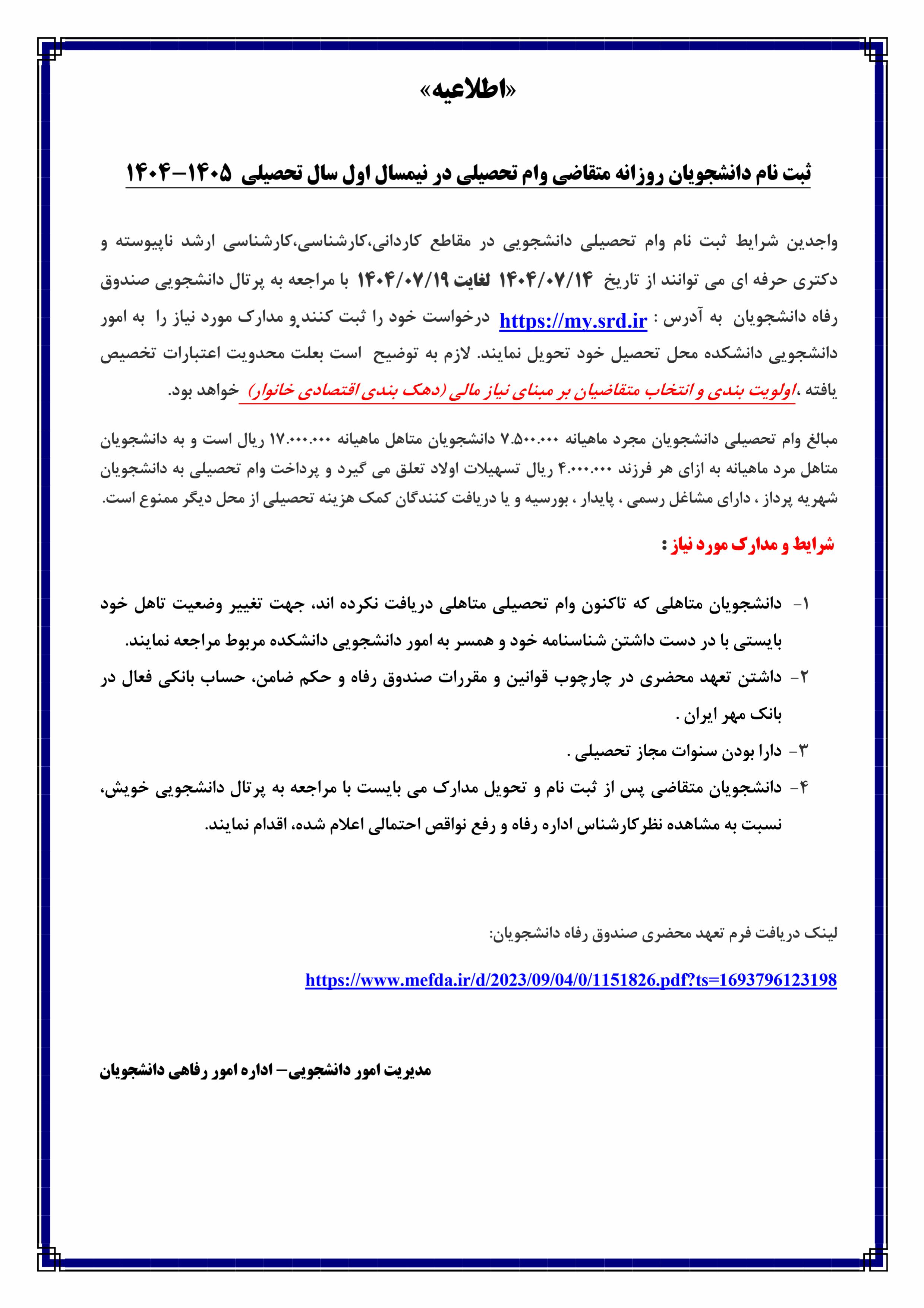 تاریخ انتشار : دوشنبه ۱۴ مهر ۱۴۰۴ تعداد بازدید کنندگان خبر : 24 زمان مطالعه : 1 دقیقه ثبت نام وام دانشجویان روزانه متقاضی وام تحصیلی نیمسال اول سالتحصیلی 1405-1404 کد خبر : 95959 کپی ارسال نظر ثبت