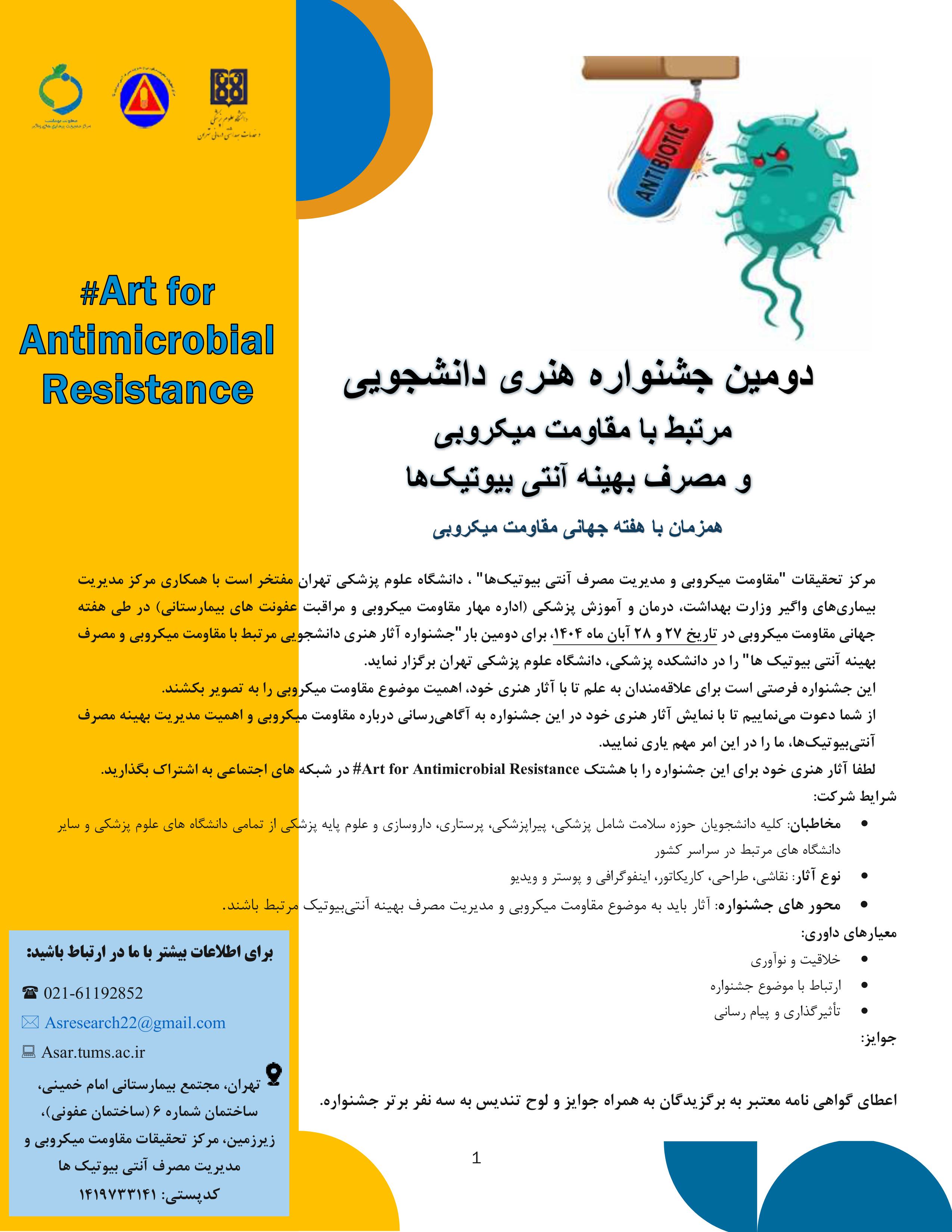 تاریخ انتشار : سهشنبه ۱۵ مهر ۱۴۰۴ تعداد بازدید کنندگان خبر : 11 زمان مطالعه : 1 دقیقه دومین جشنواره هنری دانشجویی مرتبط با مقاومت میکروبی و مصرف بهینه آنتی بیوتیک ها کد خبر : 95989 کپی ارسال نظر ثبت
