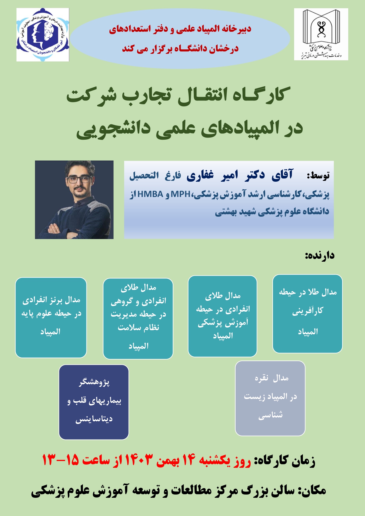 کارگاه انتقال تجارب شرکت در المپیادهای علمی دانشجویی دکتر امیر غفاری کد خبر : 47478 کپی کلمات کلیدی : دانشگاه علوم پزشکی تبریز دانشکده پیراپزشکی تبریز دکتر امیر غفاری